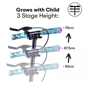 Adjustable handlebars at three heights (83 cm, 87.5 cm and 92 cm) grow with riders.