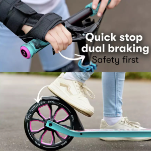 Its two large 200 mm wheels and ABEC 7 chrome bearings deliver bump-free journeys while dual braking systems ensure safe stopping.
